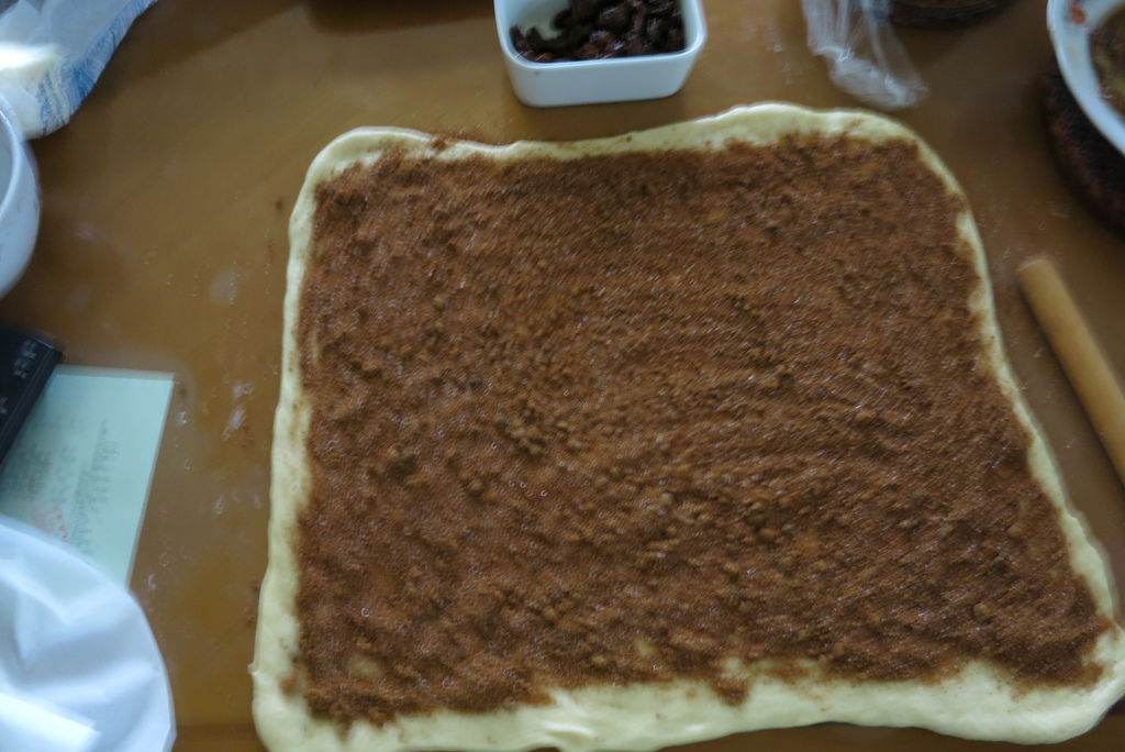均勻撒上事前準備好的糖粉 (2大匙的肉桂粉, 6大湯匙(餐桌上舀湯用) 黑糖, 一大湯匙的白細砂糖